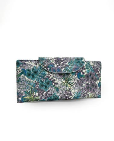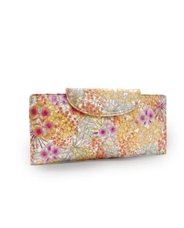 南国を思わせる花や草木のデザインをプリントして最後にモザイクのような型押し加工を