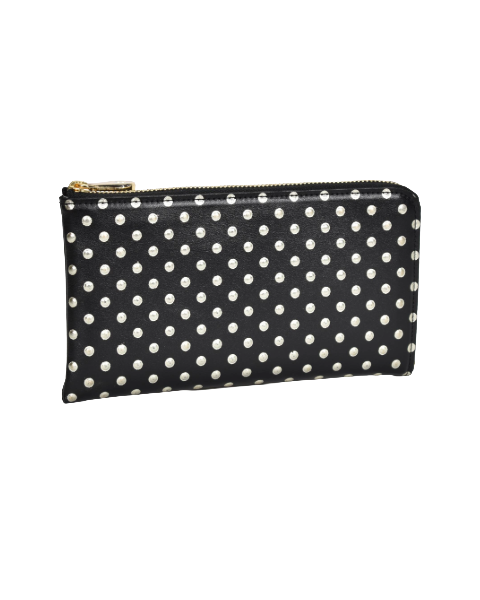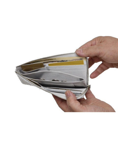 まるで金属のスタッズを打ち込んだようなイタリア製の牛革を使用したシリーズ。 パッと目を引く「カッコカワイイ」アイテムです。 「お札を折りたくないけど、できるだけ小さめのお財布が欲しい・・・」 そんな声からできた、お札にジャストサイズのLファスナーです。 ファスナーを開ければ、カード、お札、中央小銭入れが見渡せます。