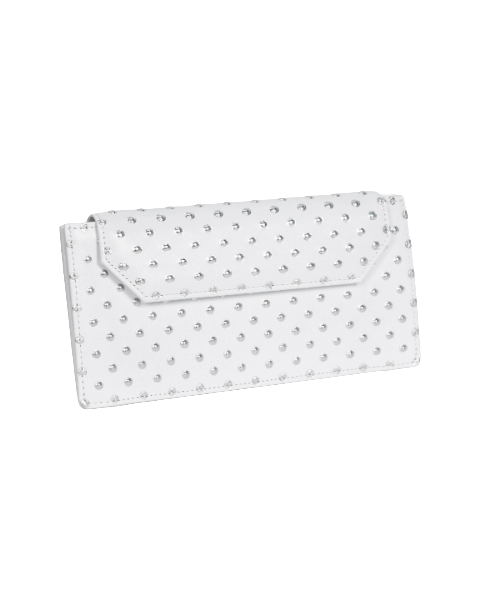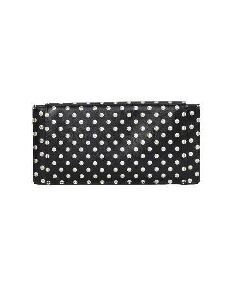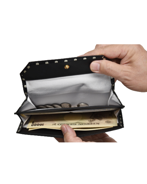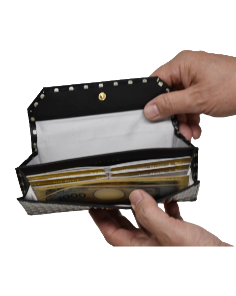 まるで金属のスタッズを打ち込んだようなイタリア製の牛革を使用したシリーズ。 パッと目を引く「カッコカワイイ」アイテムです。 「できるだけお札が見えないようにしたい・・・」そんな声からリニューアルした単 束入れ。かぶせの部分が大きくなりました。 お札を折らずに入れられて、カードは6枚収納可能。小銭は大きく開いて見やすく取り出 しやすい作りになっています。