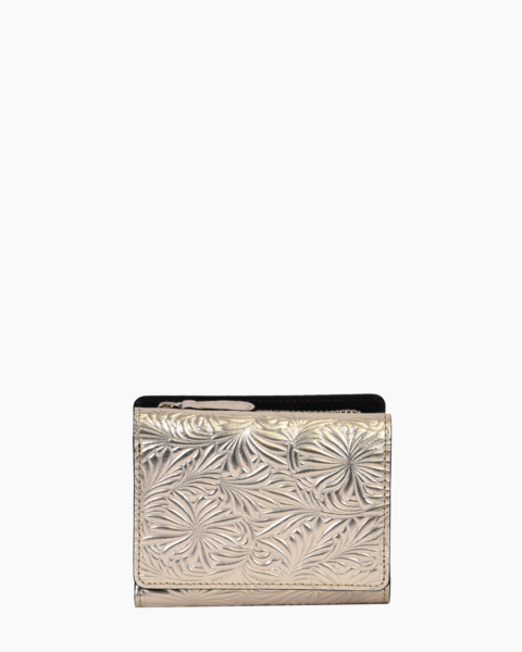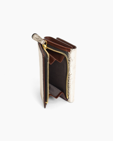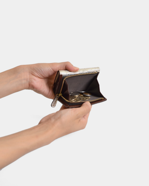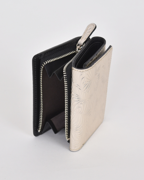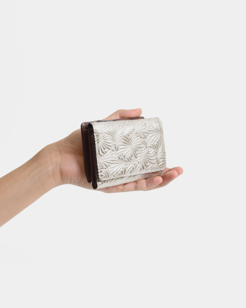 イタリア製エンボスレザーによる財布シリーズです。モチーフはデイジー(ひな菊)の花と葉で、エキゾチックでむしろ日本的な印象も受ける型押しです。ベースとなるのは牛キップ(仔牛)にミラー箔という金属にも似た質感を持つ箔フィルムです。それだけでは過度なギラつきが出てしまうのでホワイトアンティーク加工を施し、絶妙なヴィンテージ感を表現しています。小さい三つ折りのお財布は、バッグのなかでコンパクトに収まります。