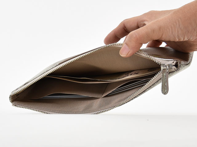 カラーレザーとメタリックの刷毛目の対比が印象的です。※柄の出方は個体差があります