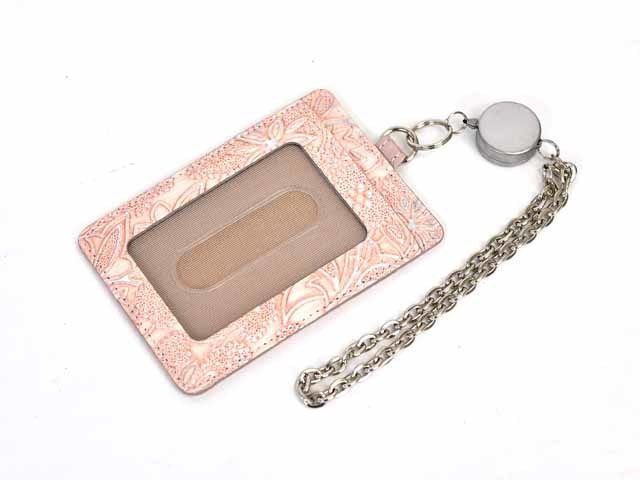 イタリアの革職人が染色した革を型押ししたあと、浮かび上がった花模様を一点一点手作業でシルバーの染色をしています。