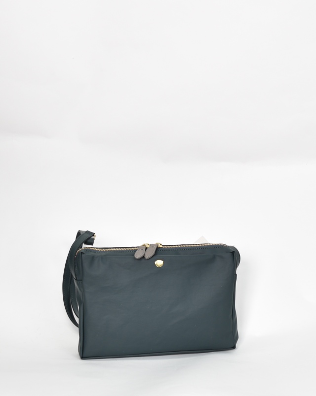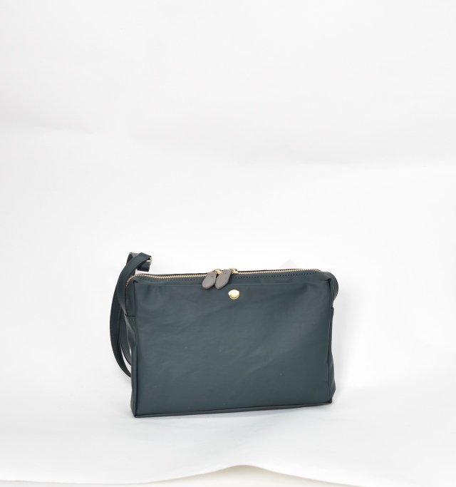 コットン生地でもなく、合皮でもなく、革でもない。ジェーンは不思議な素材です。コットン100%のキャンバスに、撥水性を持たせるため、極薄いPVCをコーティング。それだけでは表面のビニールっぽさが際立ってしまうので、生地裏からキャンバスとPVCの隙間の空気を抜く「バキューム加工」をして、生地目がしっかりと見えるようにしました。さらに、岡山のデニム加工所で生地のまま洗い、やわらかな風合いを出しています。雨の日にも快適に使え、軽いことも特徴です。一見分からないように縫い目との間に仕切られたポケットなど、外観を損なうことのない収納にこだわっています。小ぶりのポシェットは1つあると便利ではないでしょうか?