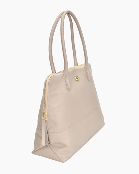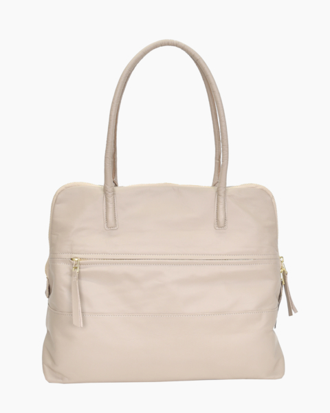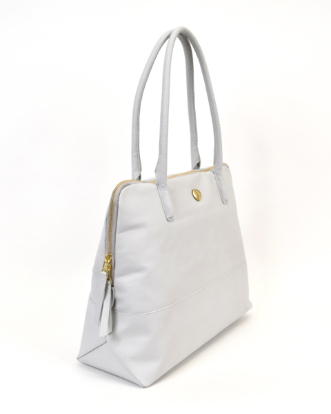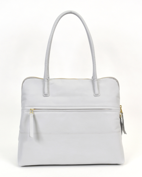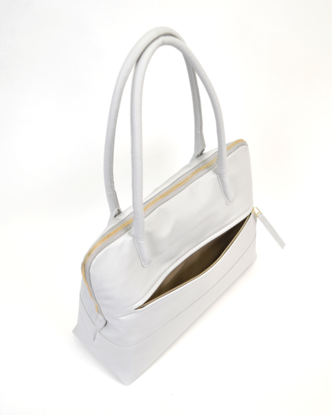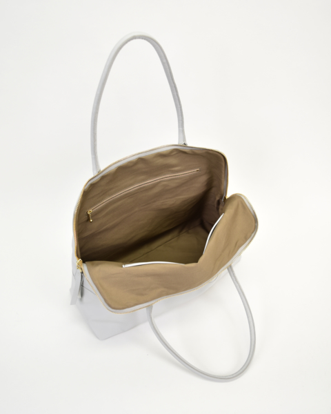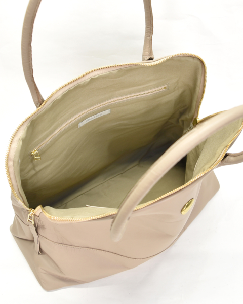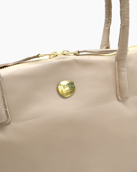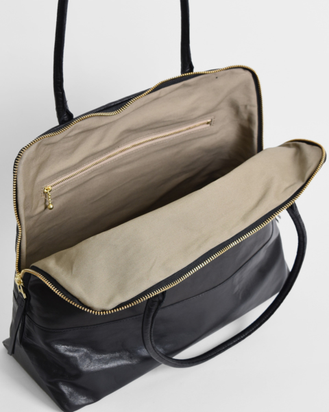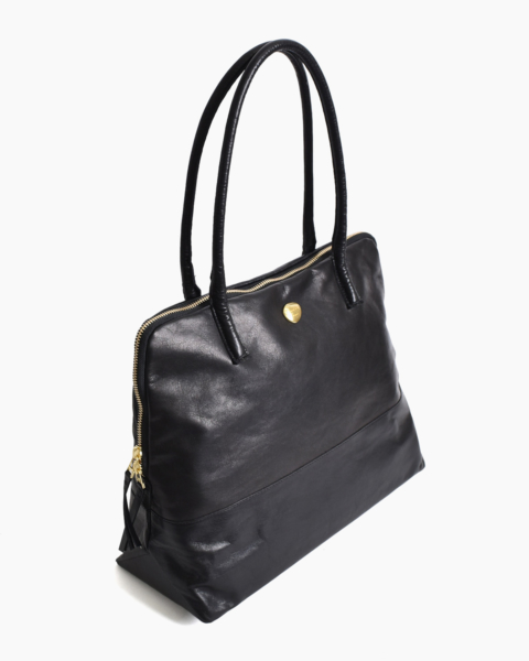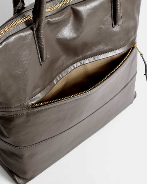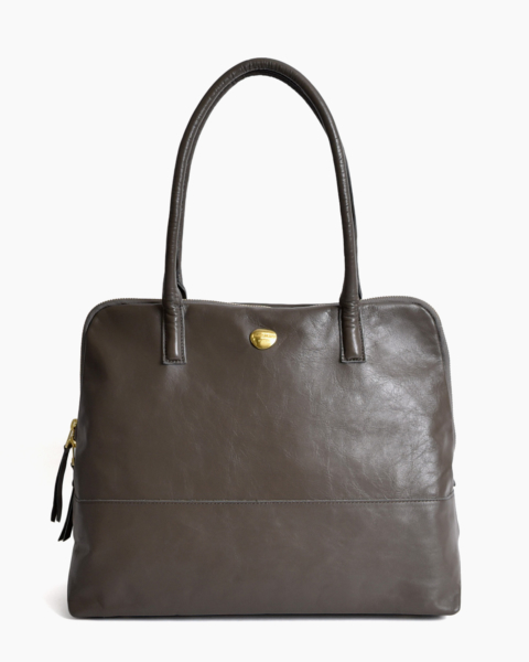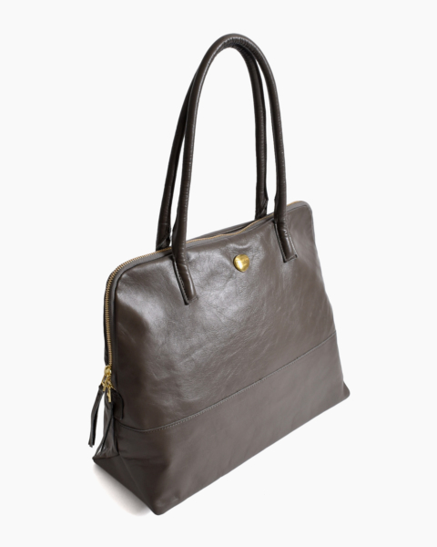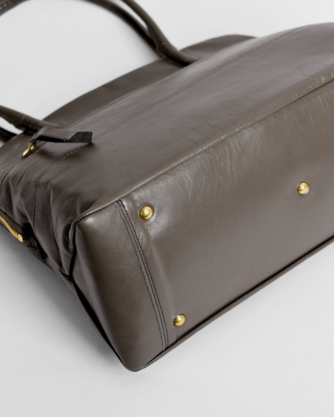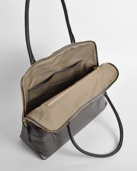 定番素材のホースレザーバッグです。使用しているホースレザーは、繊維が密にからみあっているので、薄くても、丈夫な素材。ワックスを浸透させ仕上げることで、上品で落ち着いた雰囲気に仕上がっています。極力シンプルなデザインを崩すことなく“道具”としての機能を最大限取り入れるため、例えば、モノの出し入れにストレスのかからない開閉口や、使いやすい位置にあるポケット、ファスナー部分は体と当たることも考えて、金属と擦れないよう隠しファスナーに。と、さまざまな工夫をしています。A4まで収納できるサイズです。