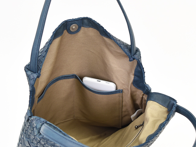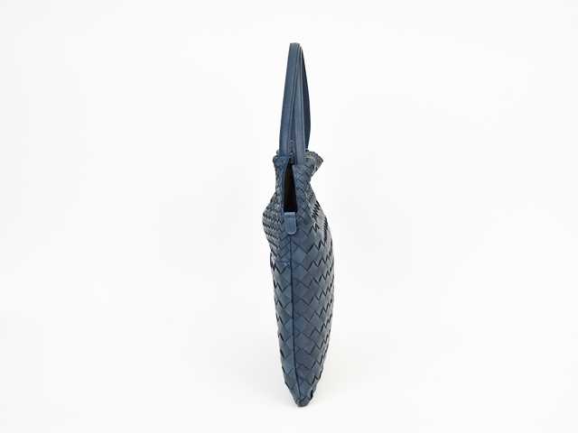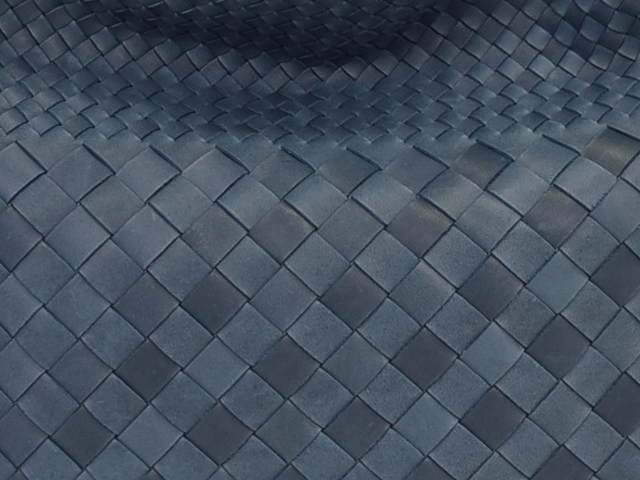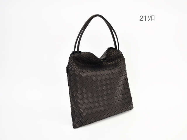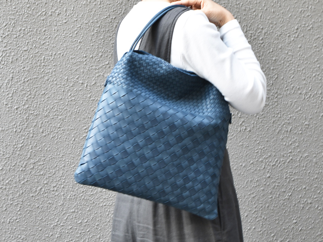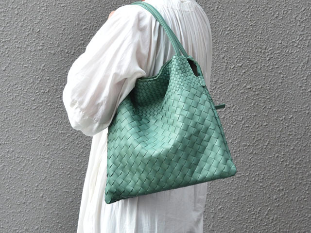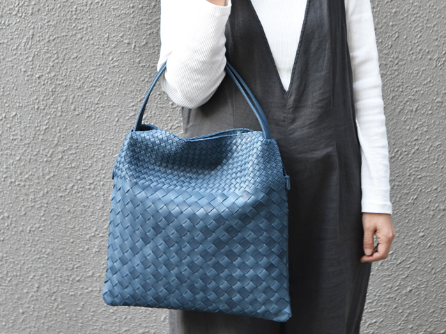 一枚の革に上に細目、下に太目で重ねるように編まれたオリジナルメッシュを素材にかごの様にデザインしました。粗野な口元の切りっぱなしがポイントです。