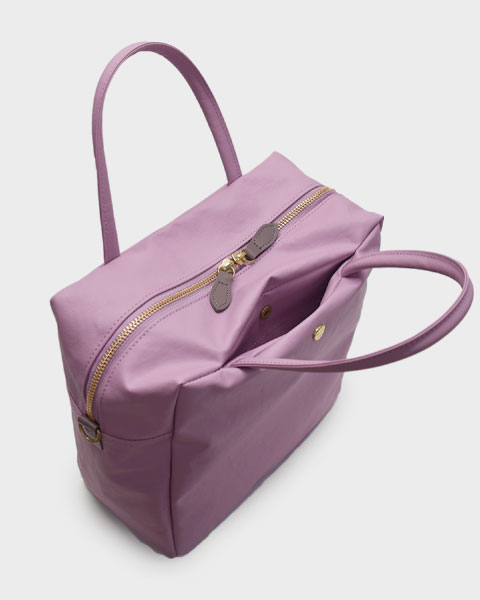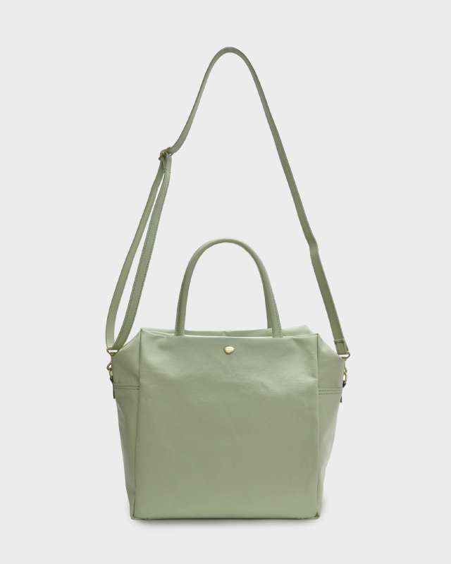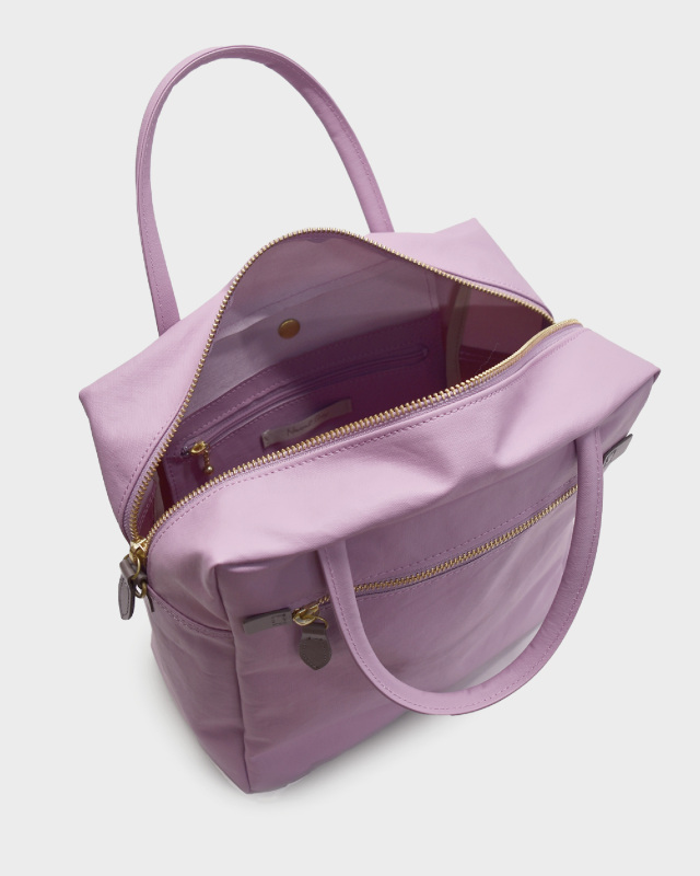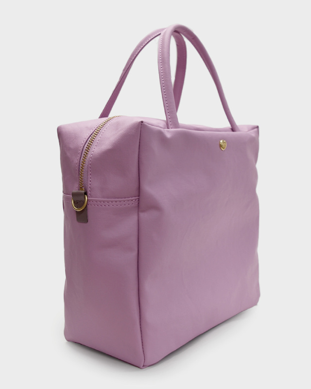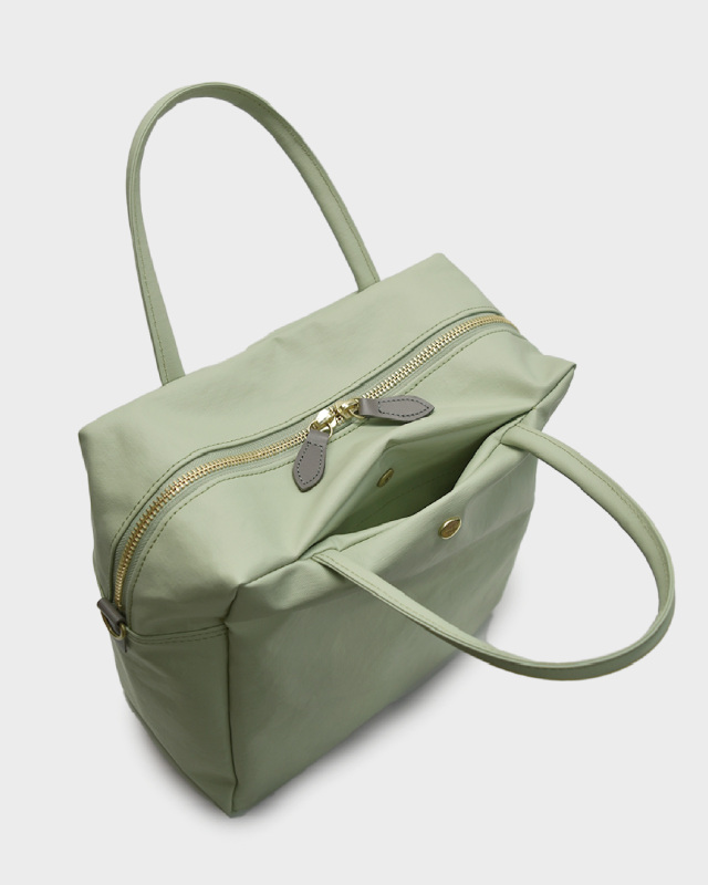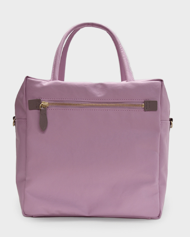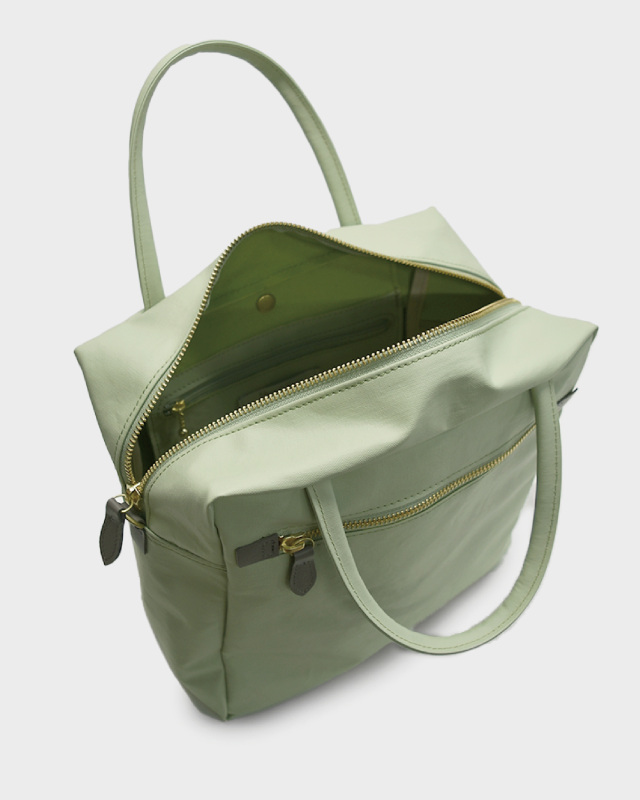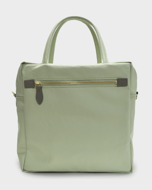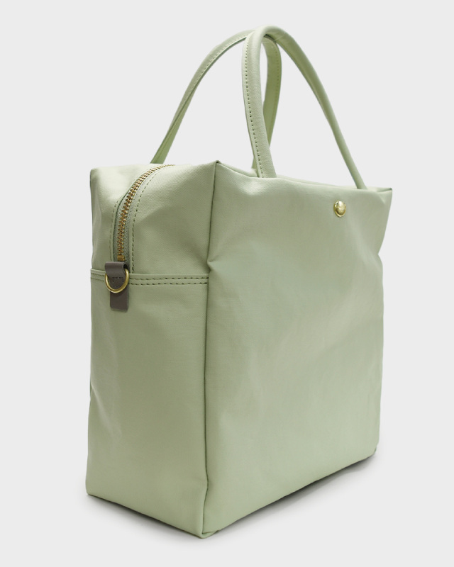 コットン生地でもなく、合皮でもなく、革でもない。ジェーンは不思議な素材です。コットン100%のキャンバスに、撥水性を持たせるため、極薄いPVCをコーティング。それだけでは表面のビニールっぽさが際立ってしまうので、生地裏からキャンバスとPVCの隙間の空気を抜く「バキューム加工」をして、生地目がしっかりと見えるようにしました。さらに、岡山のデニム加工所で生地のまま洗い、やわらかな風合いを出しています。雨の日にも快適に使え、軽いことも特徴です。荷物がしっかりと入るサイズ感の2WAY仕様。口前のホック付きポケットと背側にもファスナーポケットが有り、小物も収納しやすくなっています。ショルダーストラップの取り外しが可能です。
