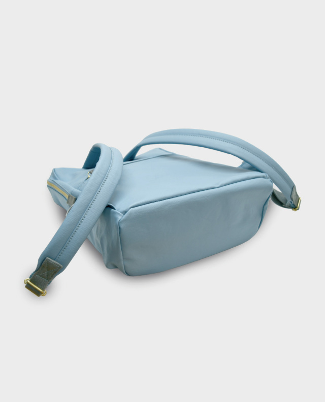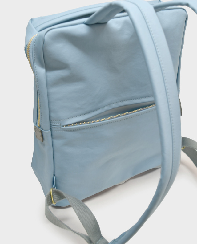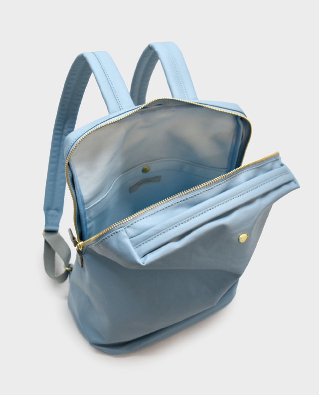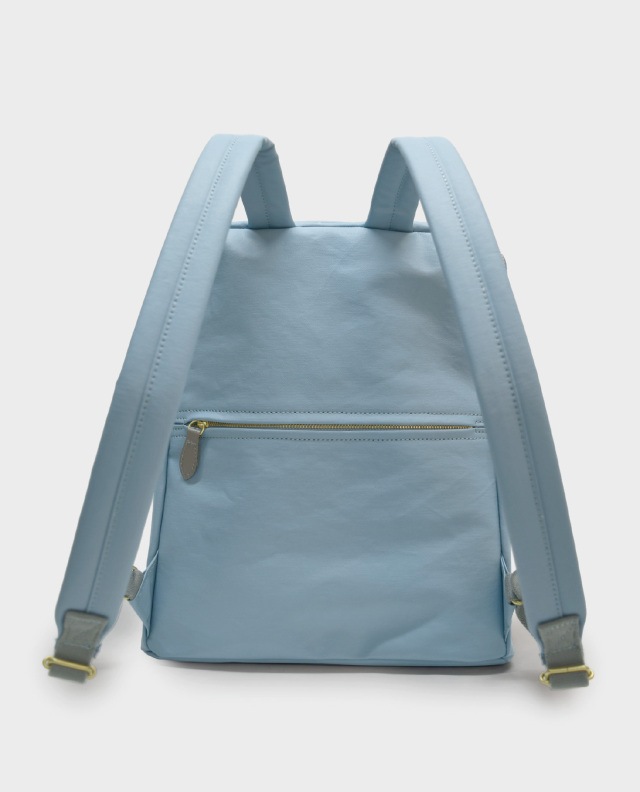 コットン生地でもなく、合皮でもなく、革でもない。ジェーンは不思議な素材です。コットン100%のキャンバスに、撥水性を持たせるため、極薄いPVCをコーティング。それだけでは表面のビニールっぽさが際立ってしまうので、生地裏からキャンバスとPVCの隙間の空気を抜く「バキューム加工」をして、生地目がしっかりと見えるようにしました。さらに、岡山のデニム加工所で生地のまま洗い、やわらかな風合いを出しています。雨の日にも快適に使え、軽いことも特徴です。ファスナーを出来るだけ背中側に配し、極力縫い目を見せないよう仕立てることで、スポーティな形にも独特な“間”が生まれました。ダブルジップで口元が大きく開くのでストレスなくモノの出し入れが出来ます。