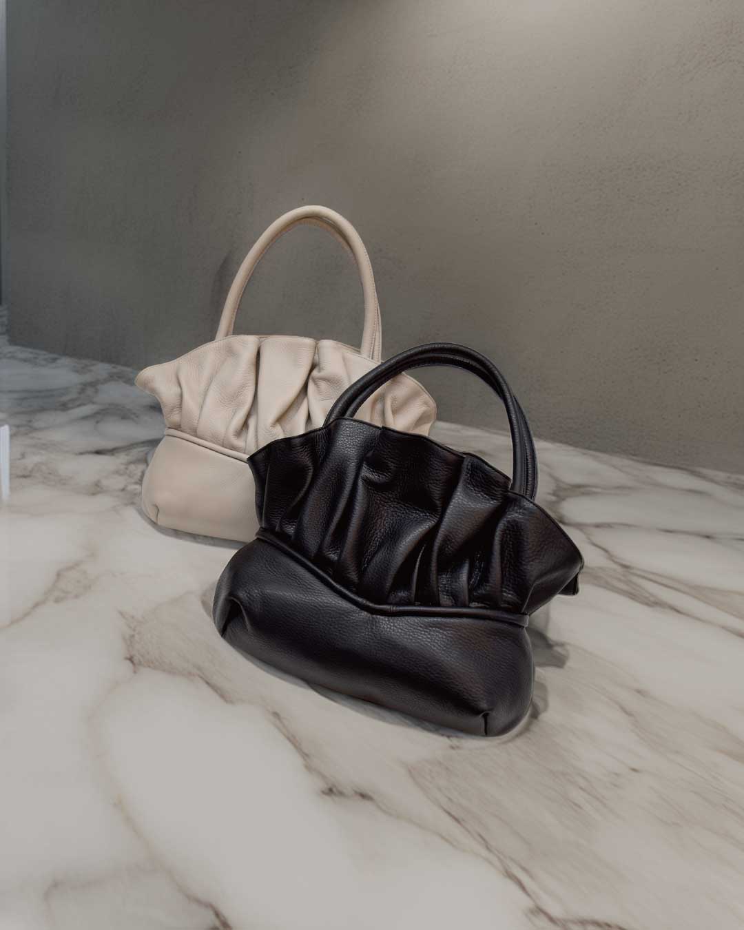 レザーを折り重ねた立体的なディテールが印象的。